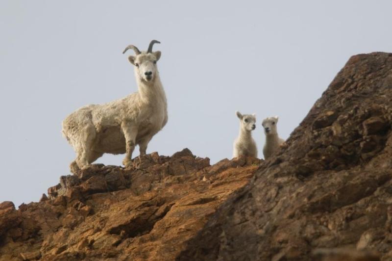 Dall sheep spend most of their lives on the jagged slopes of mountains. Their cloven hooves with rough pads help them cling to cliff edges and broken ledges, where they flock to elude predators that cannot traverse such terrain.
