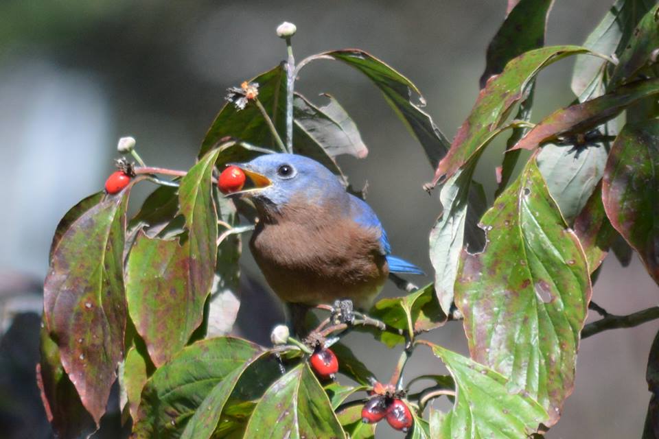 Eastern Bluebirds are soft-billed, which requires their diet also be comprised of soft food because they cannot crack shells. They eat mostly insects such as caterpillars, beetles, crickets, grasshoppers and spiders, which they catch on the ground. When seasonally available, bluebirds also eat fruit such as mistletoe, sumac, blueberries, black cherry, tupelo, currants, wild holly, dogwood berries, hackberries, honeysuckle, bay, pokeweed, and juniper berries.