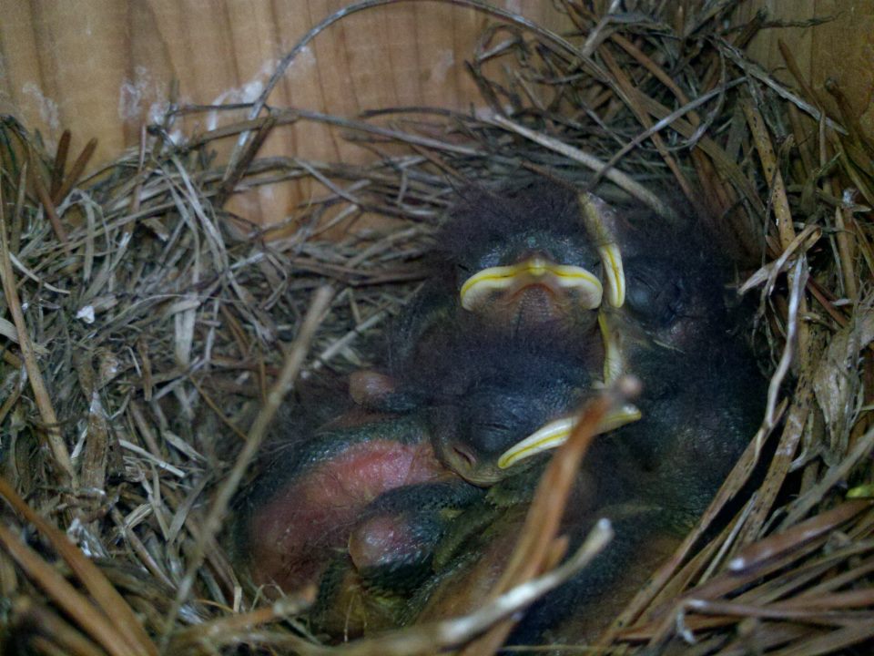 Two summers ago, a snake somehow managed to bypass my system again and managed to dine on day old fledglings and their mother. I was heartbroken. The door was not breached. There were no animal tracks at the base. My best guess is that a snake dangled precariously from a pine branch above the box during the night and startled the female while she was keeping the hatchlings warm. I pruned those branches and cleaned the old, now flattened nest out of the box. For weeks afterwards, I watched in sadness from my office window as the male tried to secure a new mate. He would wing flap and vocalize all day long. Only occasionally, a female bluebird would come by and check out the box. It was the middle of the summer, so all the local females were already paired off and rearing their young. After about a month, he found a mate. And there were eggs soon after. After the eggs hatched, and I guess somewhat out of guilt, I placed a small plastic bowl of dried mealworms on the ground in front of the nest box. The male vocalized from a branch above in what I can only assume was the bluebird equivalent of a cursing out. No bluebird had ever quite spoken to me so harshly. But there were no swoops or head pecks, thankfully. I returned to my desk just in time to watch in disbelief as he launched a full attack at the bowl. After the attack, he grasped the bowl with his talons and carried it several feet, several times, with dried mealworms spilling out with each journey. When he was done, the empty bowl was at least fifty feet from the nest box. The bowl was subjected to regular attacks until I had a moment to retrieve it. It was disconcertingly violent and a clear act of anger. Daddy did not want any strange items near his babies. He had already lost one family. He was not losing another.